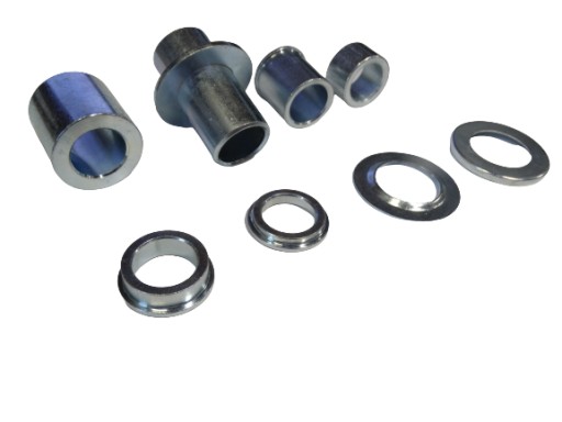 W skład zestawu wchodzą: tulejka wahacza dwuramówka WSK B1 koło, tulejka dystansowa koła długa, dystans koła, tulejka dystansowa koła krótka, miseczka zębatki tył, tulejka zębatki koła, tulejka wahacza zębatki, miseczka osłona zębatki.