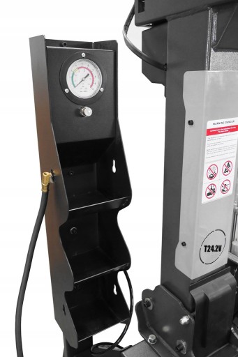 - Montażownica posiada wbudowany manometr oraz dodatkowy pedał do sprawnego pompowania kół.
