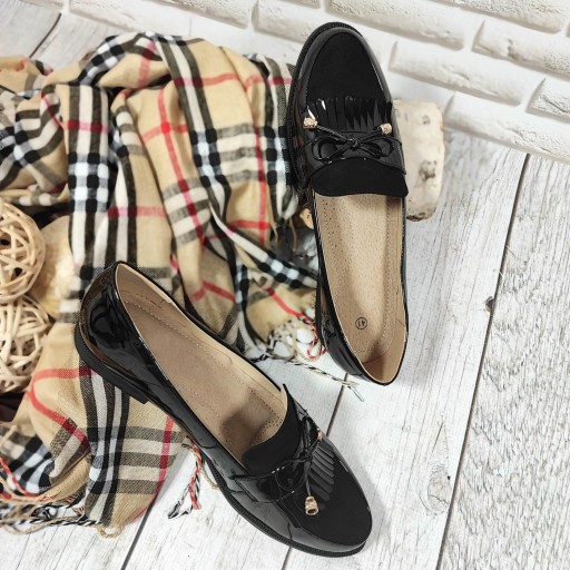 Wykonane z miękkiej lakierowanej skóry ekologicznej klasyczne mokasyny damskie. Połączenie dwóch faktur - połyskującego lakieru i matowego zamszu. Płaski obcas. Wewnątrz miękka, komfortowa wkładka z naturalnej skóry.