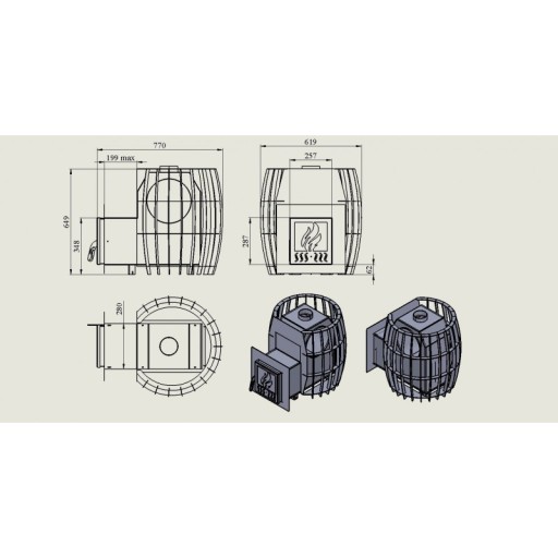 Beczka 16 Piec do sauny przeznaczony jest do łaźni parowych o pojemności od 8 do 16 m3. Ogrzewane z sąsiedniego lokalu.