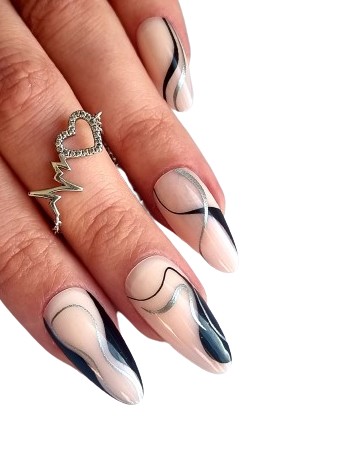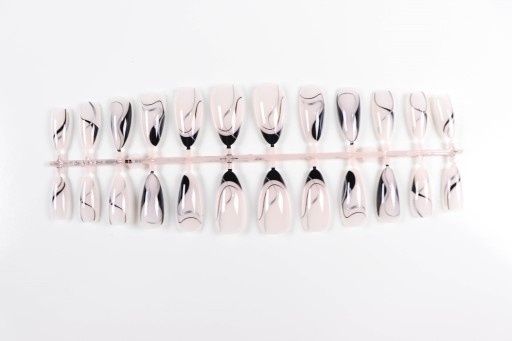 ✔️Wybrany model jest w pięknym błyszczącym kolorze w odcieniach nude z ozdobnym motywem linii nici w kolorze czarnym oraz srebrnym. Paznokcie w kształcie migdała.