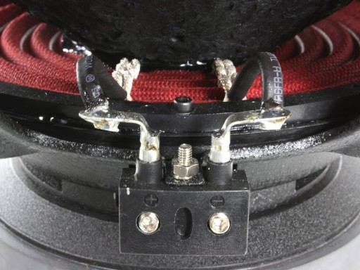 - Górne zawieszenie typu HDR (High Density & High Roll) - bardzo wytrzymała konstrukcja o wysokich właściwościach tłumiących zapewniająca duży zakres liniowego wychylenia membrany. Aby zagwarantować wysoką wytrzymałość mechaniczną, fałd górnego zawieszenia został przyklejony oraz dodatkowo przyszyty do stożka membrany.