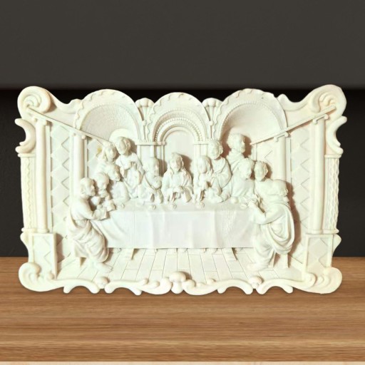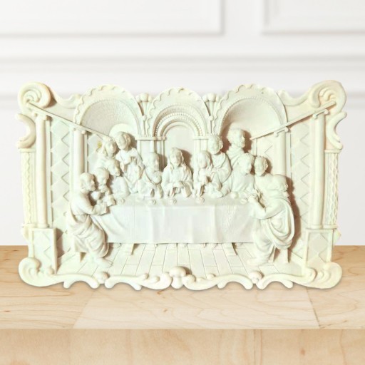 [Opisy]: Ta dekoracja z figurkami religijnymi przedstawia ludzi siedzących i jedzących razem kolację, wyglądających bardzo świątecznie, o wymiarach 9,45 x 5,91 cala.