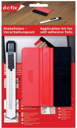 - Zestaw składa się z rakli pokrytej filcem, który zabezpiecza wzór folii podczas jej aplikacji jednocześnie umożliwia prawidłową aplikację folii okiennych poprzez dokładne usunięcie wody i pęcherzyków powietrza.