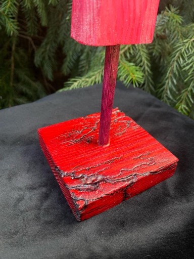 Figurka jest wykonana z drewna bukowego. Drewno wypalano prądem, który tworzy wyjątkowe wzory, następnie barwiono bejcą wodną. Drewno jest zabezpieczone lakierem.
