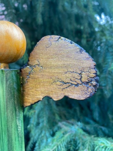 Figurka jest wykonana z drewna bukowego. Drewno wypalano prądem, który tworzy wyjątkowe wzory, następnie barwiono bejcą wodną. Drewno jest zabezpieczone lakierem.