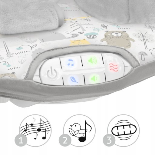 - Moduł sensoryczny, który zawiera: 10 przyjemnych melodii z regulacją głośności oraz wibracje, które działają uspokajająco na dziecko.