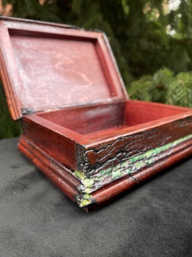 Ręcznie wykonana drewniana szkatułka. Drewno jest wypalane prądem, który tworzy wyjątkowe wzory, następnie barwione bejcą wodną i lakierowane. Dodatkowo szkatułka posiada ozdobne oczka wypełnione żywicą epoksydową.