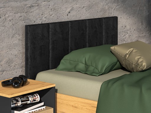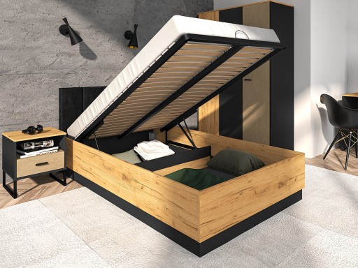 Łóżko COLT 0901 z tapicerowanym zagłowiem, pojemnikiem oraz stelażem na metalowej ramie.