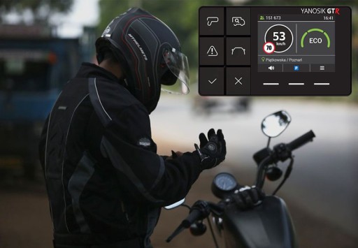 Yanosik GTR posiada także specjalnie zaprojektowany interfejs dla motocyklistów, który ułatwia korzystanie z urządzenia podczas jazdy motocyklem. Duże fizyczne przyciski pozwalają bez problemu obsługiwać urządzenie nawet w rękawiczkach!