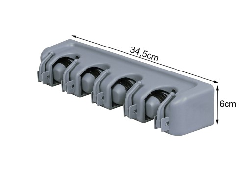 Wieszak wyposażony jest w specjalne uchwyty, w których zamocujemy urządzenia z drążkiem o różnej średnicy. Uchwyt posiada dodatkowo 5 małych wieszaczków, do zawieszenia ściereczki lub innych drobnych akcesoriów gospodarstwa domowego.