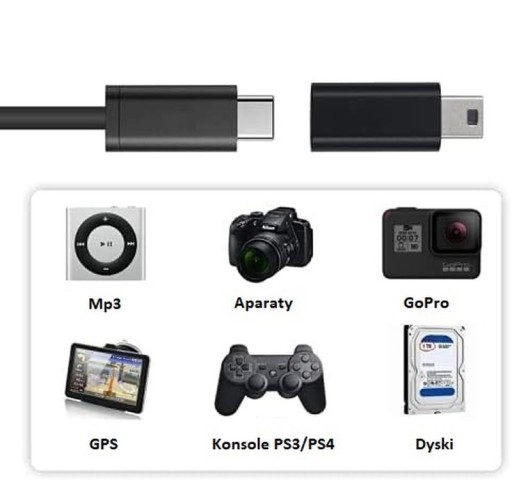 - Końcówki wtyk MiniUSB – gniazdo USB3.1 Typ C