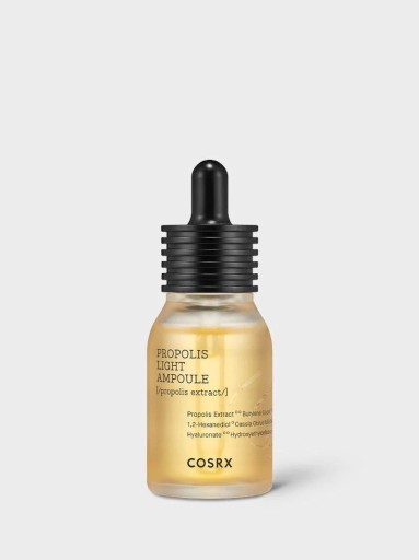 Cosrx Propolis Light Ampule ta ampułka / esencja / serum do twarzy o lekko lepkiej konsystencji jest doskonałym zabiegiem dla skóry wrażliwej, która jest również podatna na trądzik. Propolis jest bardzo kojący i naprawia, ale jest także antybakteryjny, więc może być skuteczny w obu tych problemach ze skórą. Propolis - jego naturalny składnik nawilżający, aminokwasy i witamina B5 reeksturują i oczyszczają skórę. Zintensyfikowane składniki odżywcze w ampułce wzmacniają barierę skóry i zatrzymują wilgoć. Ampułka do twarzy rozświetla cerę i zapewnia długotrwałe nawilżenie, zapewniając promienny, młodzieńczy blask. Ma jedwabistą teksturę, która zapewnia nawilżenie i elastyczność skóry!