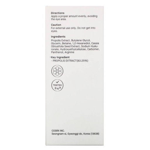 Skład: Propolis Extract, Butylene Glycol, Glycerin, Betaine, 1,2-Hexanediol, Cassia Obtusifolia Seed Extract, Sodium Hyaluronate, Hydroxyethylcellulose, Carbomer, Panthenol, Arginine