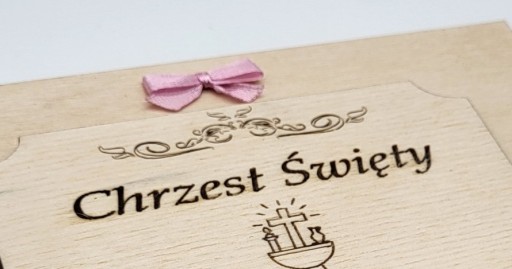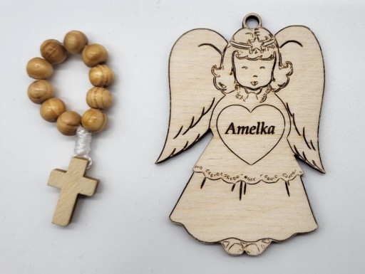 - aniołek wykonany ze sklejki wraz z wygrawerowanym imieniem dziecka. aniołek posiada oczko do przewiązania tasiemką, przez co można go powiesić