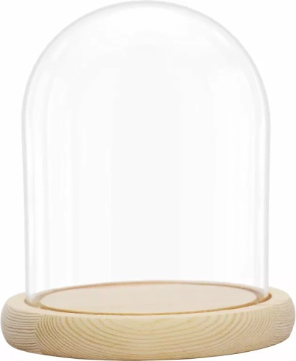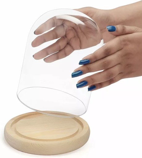 NATURALNA DREWNIANA PODSTAWA: Podstawa naszego klosza wykonana jest z drewna sosnowego. Posiada rowki, w które można dopasować szklaną kopułę i zapobiega jej kołysaniu się i przesuwaniu. Podstawa została wyszlifowana na gładko i ukazuje naturalne sęki i słoje drewna. Ponieważ baza ta jest niewykończona, można na nią nakładać oleje, bejce i lakiery. Można go również pomalować na dowolny kolor, aby dopasować go do zawartości wewnątrz.