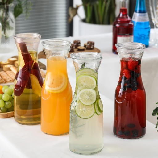 WŁAŚCIWY ROZMIAR: W tym opakowaniu znajdują się 4 karafki, każda ma 26,4 cm wys. x 9 cm szer., może całkowicie zmieścić się w drzwiach lodówki i międzywarstwie. Jest to odpowiedni rozmiar do serwowania soków w barze Mimoza. Możesz go przechowywać w lodówce, aby zaparzyć lub przechowywać.