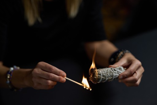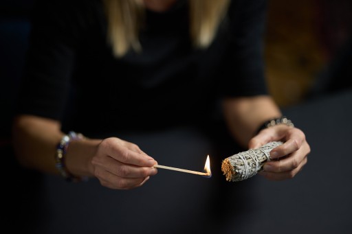 Zapalamy końcówkę liści Białej Szałwii a następnie zdmuchujemy Żarzące się liście uwalniają świeży dymny zapach.