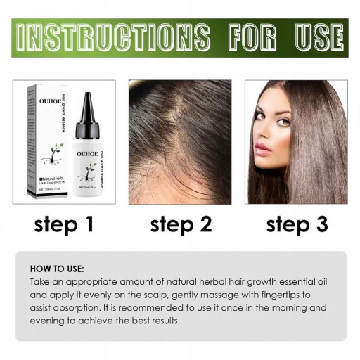 Nakładaj bezpośrednio na skórę głowy i masuj przez kilka minut dziennie, aby uzyskać lepsze rezultaty. Jeśli cierpisz na wypadanie włosów, stosuj codziennie na dotknięte obszary.