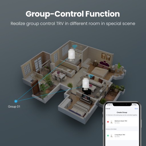 [Funkcja sterowania grupowego] -TRV można ustawić w grupie z zaworem w innym pomieszczeniu, realizując sterowanie grupowe w wykonaniu specjalnym.