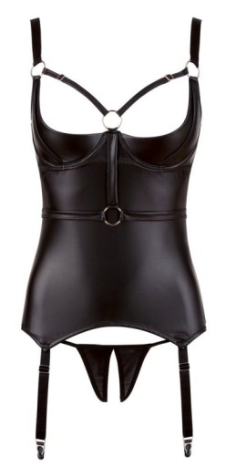Gorset z odkrytymi piersiami wykonany z matowej tkaniny. Ozdobiony metalowymi detalami. Z tyłu kajdanki. Ramiączka i 6 pasków do pończoch są regulowane. W komplecie stringi. Materiał: 90% poliester, 10% elastan. W komplecie nie ma pończoch.