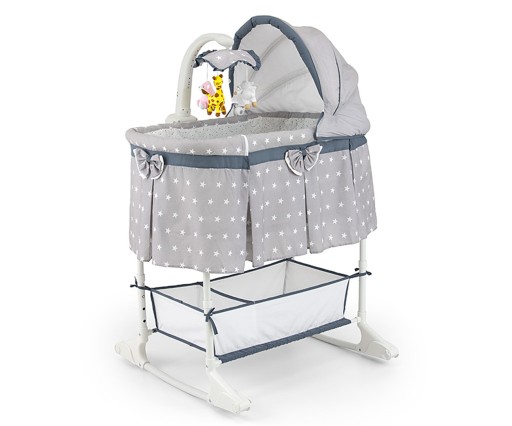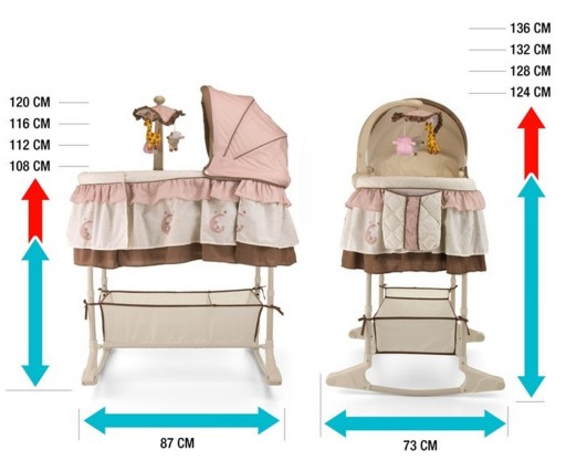Wielu rodziców doceniło to, że kołyska Sweet Melody ma wiele udogodnień atrakcyjnych dla dzieci i rodziców. Ogromną jej zaletą jest to, że jest produktem wielofunkcyjnym, może być wygodnym łóżeczkiem lub tradycyjną kołyską. Posiada kółka dzięki którym możemy swobodnie przestawić ją w dowolne miejsce domu bądź ogrodu posiada w zestawie moskitierę która ochroni dziecko przed insektami. Mobilność Kołyski daje ogromny komfort bo dziecko zawsze będzie blisko rodziców. Posiada dolny koszyk co pozwoli nam na trzymanie niezbędnych rzeczy zawsze blisko dziecka i na czas zareagowanie na jego potrzeby nie oddalając się od niego zanadto. Co jest bardzo ważne poszycie kołyski wykonane jest z przyjemnego w dotyku i przewiewnego materiału który można prać, dzięki czemu w każdej chwili można kołyskę odświeżyć. Posiada karuzelę z kolorowymi zwierzątkami i melodiami. Funkcje te przyciągają uwagę malucha a muzyka pomoże w uspokojeniu i wyciszeniu się dziecka. Kołyska ma opuszczaną ściankę boczną co w zestawie z lampką wbudowaną w karuzeli zapewni ogromny komfort przy codziennej i często nocnej opiece nad dzieckiem. Dla wygody rodzica funkcje te są sterowane za pomocą pilota. Jej kolejnym atutem jest regulowana wysokość na rożnych poziomach, co ułatwia rodzicom układanie dziecka do snu i zapewnienia maluchowi bezpieczeństwa.