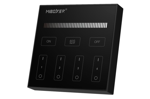 4-strefowy panel naścienny B1-B do kontrolerów Bergmen by MiBoxer, wykorzystujący technologię transmisji bezprzewodowej 2.4G RF. Umożliwia regulację jasności. Możliwość ustawienia automatycznego wyłączenia światła po 60 sekundach. Maksymalna odległość sterowania do 30 m. Zasilanie bateryjne 3 V (2 szt. AAA). Montaż nie wymagający użycia narzędzi i dodatkowego okablowania.