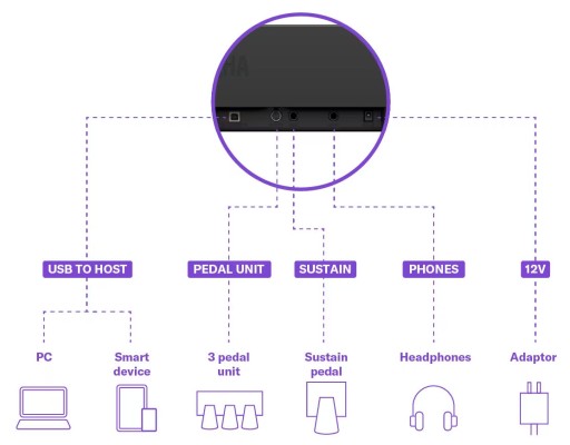 Pianino jest zaopatrzone w szereg gniazd do podłączenia słuchawek, pedałów i komputera.