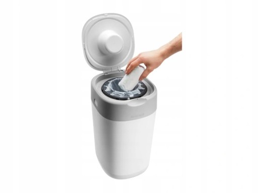 Innowacyjny pojemnik zapewnia antybakteryjną ochronę przed zarazkami i brzydkim zapachem, w ciągu kilku sekund zamykając pojedyncze pieluchy w opakowaniu. Pojemnik mieści do 28 pieluch.