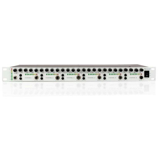 - 6-kanalowy wzmacniacz sluchawkowy z korektorem i zmiennym wejściem AUX dla każdego kanalu- 8-segmentowe LED-owe wskaźniki poziomu sygnalu dla kazdego kanalu i magistrali glównej - Dwufunkcyjna regulacja balansu dla panoramowania i miksowania sygnalu AUX oraz MAIN - Oddzielna korekcja dla kazdego kanalu - Sumowanie sygnalu mono - Wejscia i wyjscia na przednim i tylnym panelu - 19-calowa metalowa obudowa