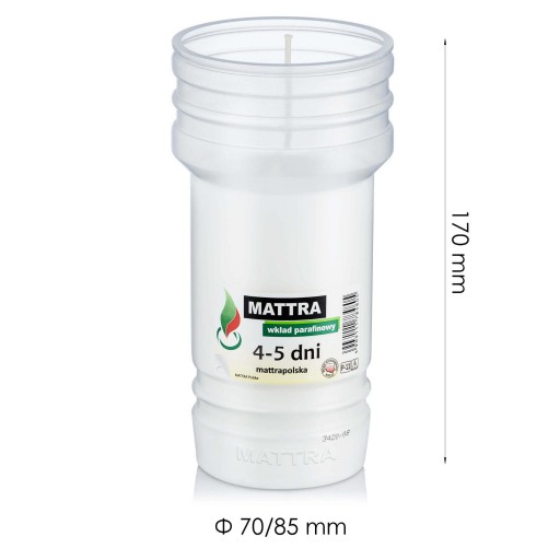 Znakiem rozpoznawczym wkładów do zniczy MATTRA jest długi czas palenia, równy i jasny płomień, oraz czystość wypalania. Dzieję się tak, ponieważ wkłady wykonane są z najwyższej jakości parafin o powtarzalnym składzie, oraz wysokich temperaturach krzepnięcia.