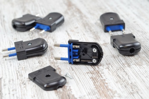 Korpus wtyczki składa się z dwóch elementów skręconych ze sobą śrubką, a zabezpieczenie przeciw wyrwaniu przewodu jest skonstruowane w taki sposób że samo zaciska przewód bez koniecznosci przykręcania.