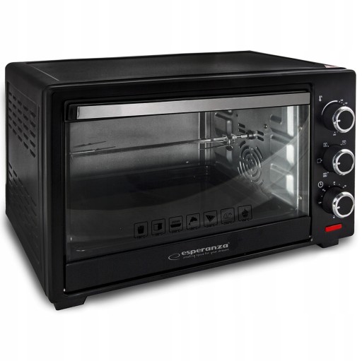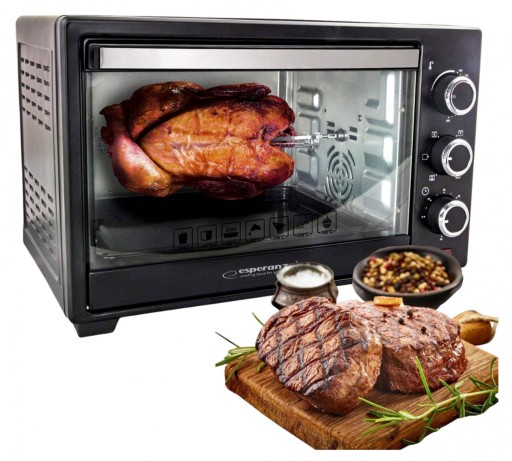 Piekarnik z konwekcją i rożnem NAPOLI; Konwekcyjny piekarnik Esperanza NAPOLI w łatwy sposób pomoże zrobić pyszną pizzę, zapiekankę, frytki albo upiecze mięso lub ryby. Piekarnik posiada także funkcje rożna, na którym bez problemu można upiec np. całego kurczaka. Specjalne ukształtowanie tylnej ścianki pozwoli upiec w całości pizzę naprawdę solidnych rozmiarów. Dolną część można łatwo i bez zbędnego bałaganu oczyścić, a to dzięki wbudowanej tacce na okruchy. Piekarnik cechuje ładny i elegancki design, dzięki czemu będzie pasował do każdej kuchni.