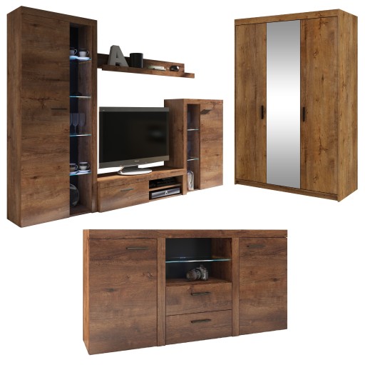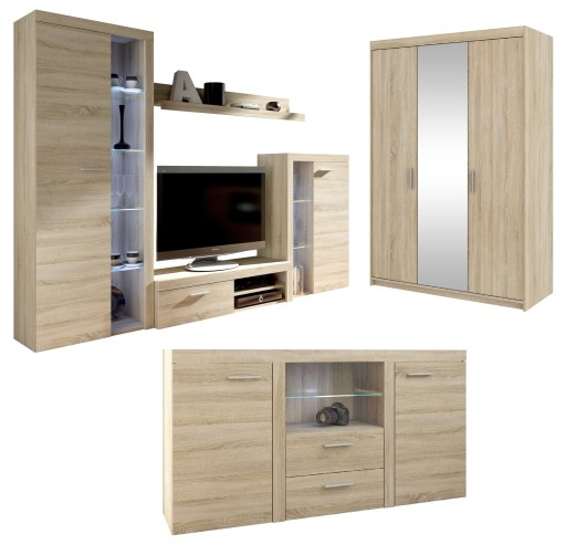 ZESTAW MEBLI RUMI MEBLOŚCIANKA + SZAFA Z LUSTREM + KOMODA DO SALONU POKOJU
