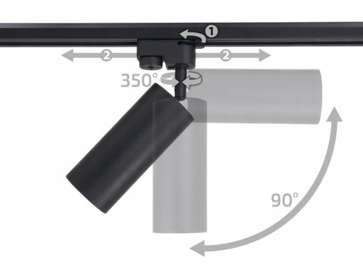 ✅Reflektor jest bardzo mobilny - można dowolnie nim przesuwać po szynie. Oprócz tego można ją obracać wokół własnej osi aż o 350 stopni + kąt przechylenia od 0 do 90 stopni. (tak jak na wizualizacji obok)
