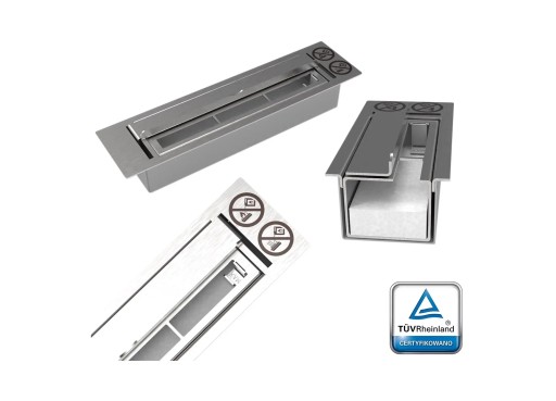 Biokominek 650x400 wyposażono w wykonany ze stali nierdzewnej palnik o łącznej długości 276 mm z podwójnym dnem oraz pokrywą do regulacji płomienia, który dodatkowo posiada: