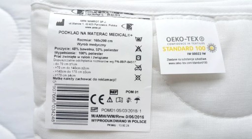 Podkład posiada Certyfikat OEKO-TEX® STANDARD 100 oraz Pozytywną opinię Instytutu Matki i Dziecka nr Op-4901,