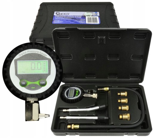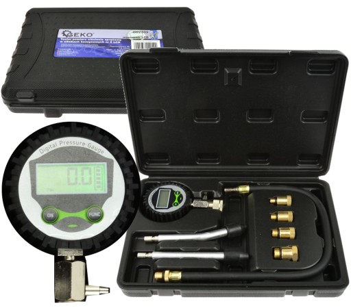 Tester pomiaru ciśnienia sprężania w silnikach z zapłonem iskrowym w samochodach i motocyklach z silnikiem benzynowym. Manometr z czytelnym wyświetlaczem LCD, wskazuje wartość pomiaru (w jednostkach: psi, Kpa, Bar, Kgf/cm²) oraz stan naładowania baterii.