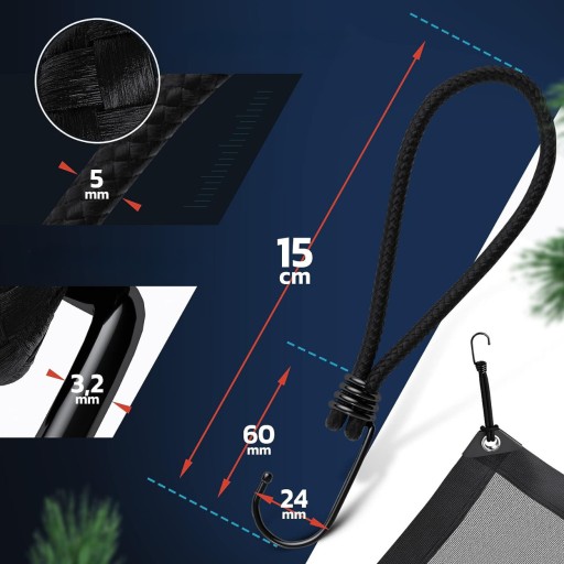 NIEZAWODNE MOCOWANIE - Nasza elastyczna guma z hakiem została zaprojektowana, aby sprostać Twoim wymaganiom. Z łatwością utrzyma obciążenie do 25 kg, zapewniając trwałe i pewne mocowanie. Bez względu na to, czy używasz jej do zamocowania siatki na przyczepie, plandeki basenowej czy czegoś innego, możesz być pewien, że Twój towar będzie bezpieczny i stabilny.