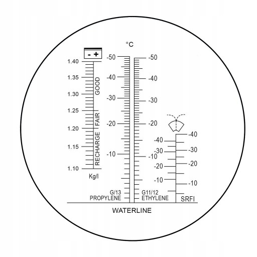 - Refraktometr pozwala na pomiar temperatury zamarzania glikolu etylenowego w zakresie od -50°C do 0°C z dokładnością wynoszącą ±1°C.