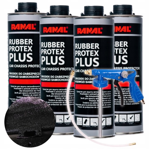 Zestaw 4 x Konserwacja Podwozia Rubber Protex Plus 1L z pistoletem to profesjonalne rozwiązanie do trwałej ochrony podwozi samochodowych przed szkodliwym działaniem żwiru, kamieni, soli i wody.