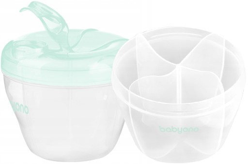 Pojemnik na mleko w proszku marki Babyono przeznaczony jest do przechowywania mleka suchego. Pozwala na odmierzenie pokarmu na cztery karmienia – w jednej komorze może zmieścić się do 8 miarek mleka, a także przygotowanie pokarmu na bieżąco. Specjalny dozownik w pokrywie ułatwia aplikację mleka.