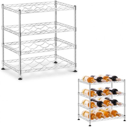 Regał posiada cztery półki o wymiarach 45 x 30 cm które pozwalają na wygodne przechowywanie butelek z winem, szampanem czy innych napojów. Każdy poziom posiada 4 wgłębienia na butelkico daje możliwość umieszczenia łącznie 16 butelek. Maksymalny udźwig półki to 50 kg. Wysokość półek można regulować w zależności od potrzeb. Można także podzielić mebel na dwa mniejsze. Złożenie regału bez użycia narzędzi, tylko przy użyciu akcesoriów dołączonych do zestawu. Srebrne wykończenie epoksydowe sprawia, że mebel można ustawić także w pomieszczeniach o podwyższonej wilgotności. Otwarta konstrukcja jest łatwa w utrzymaniu czystości oraz zapewnia dostęp do produktów ze wszystkich stron. Słupki mają wysokość 45 cm. Nóżki poziomujące zapewniają stabilność nawet na nierównej powierzchni.