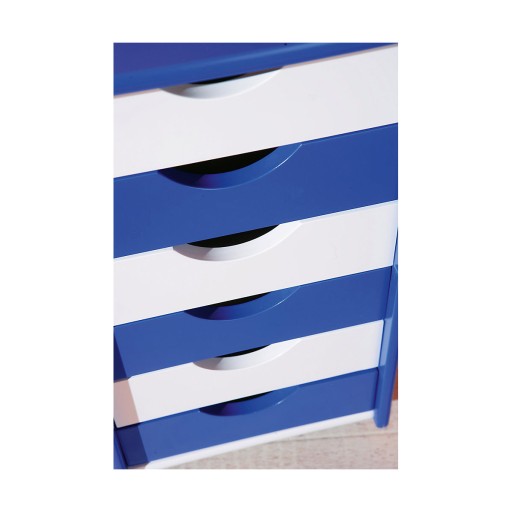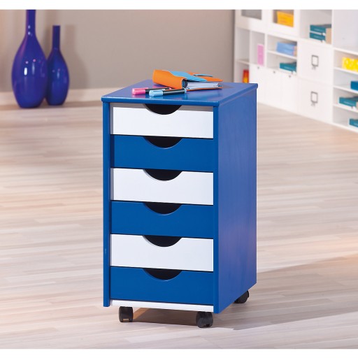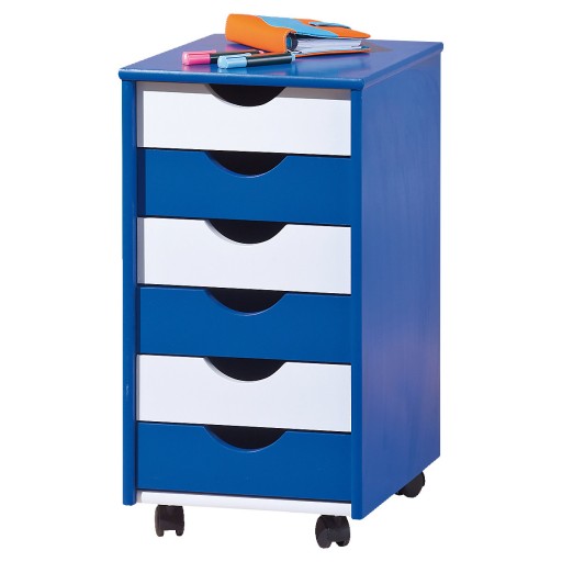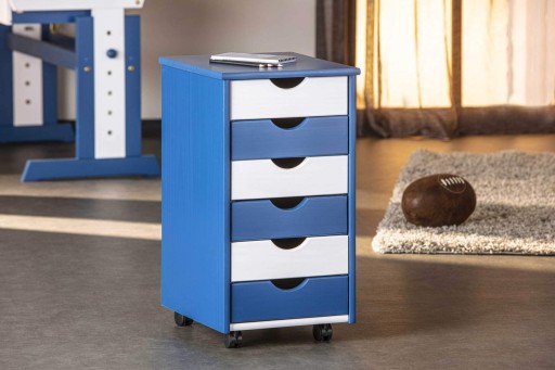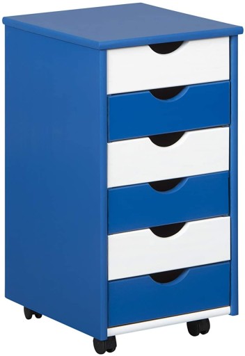 - Ta szafka na kółkach jest wykonana z litego drewna z 6 praktycznymi szufladami i 4 stabilnymi kółkami z tworzywa sztucznego, z czego 2 ze stoperami w kolorze białym i niebieskim, montaż za pomocą narzędzi