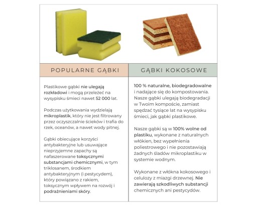 Naturalna gąbka kokosowa to świetna alternatywa, która może zastąpić plastikowe lub metalowe gąbki i drastycznie zmniejszyć negatywny wpływ na środowisko. Jest ona w 100% biodegradowalna, co oznacza, że może zostać zwrócona do ziemi bez negatywnego wpływu na środowisko. Jeśli dodamy do tego kompostowalność i nietoksyczność, to mamy pewność, że znaleźliśmy najlepszą ekologiczną alternatywę dla gąbek kuchennych.