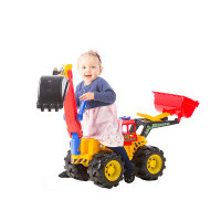 Buldożer wymiarowo pozwala na operowanie małemu kierowcy siedząc na zabawce. Dziecko może odpychając się nogami swobodnie się przemieszczać. Duże i szerokie koła zapewniają dobrą stabilizację użytkownikowi, poruszanie się po piasku i trudnym terenie nie stanowi większego problemu.