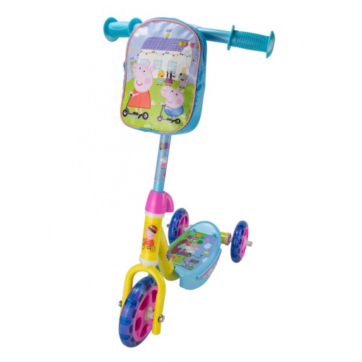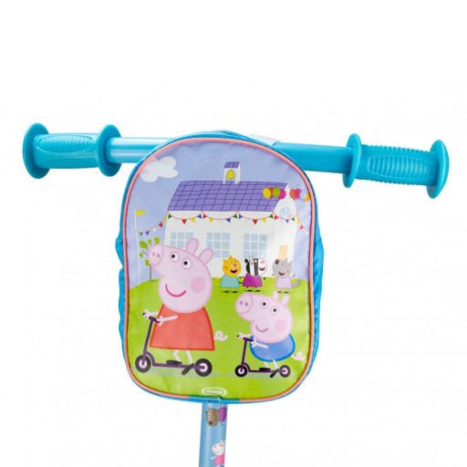 Stabilna hulajnoga dla najmłodszych, trzy kółka, fajna torba, regulowana kierownica, design Świnka Peppa.