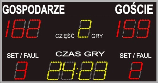 Małą, uniwersalna tablica przeznaczona do obsługi koszykówki, siatkówki, piłki ręcznej, piłki nożnej, badmintona i innych.