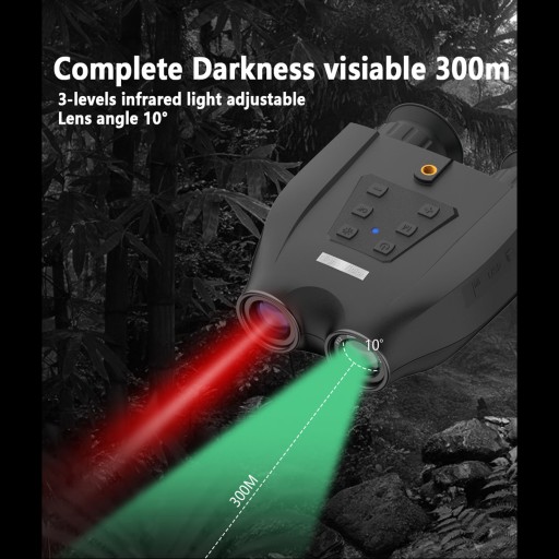 1. Szczegóły lornetki: Lornetka noktowizyjna z 2 wbudowanymi ekranami TFT HD o przekątnej 1,4 cala, rozdzielczością 360 x 360 pikseli TFT, 8-krotnym zoomem cyfrowym i szerokim polem widzenia 10°, umożliwiająca regulację ostrości widzenia w lewo i w prawo podczas użytkowania.