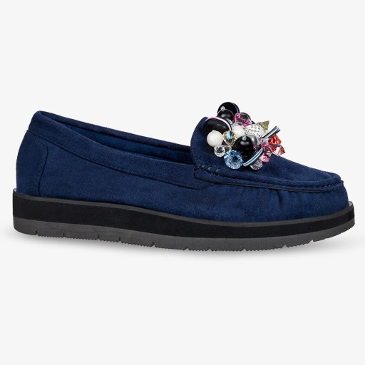 Granatowe mokasyny damskie z ozdobą model D23WX4-N zostały wykonane z wysokogatunkowego zamszu ekologicznego co gwarantuje doskonałą jakość, wygodę i dopasowanie do stopy. Skórzana wkładka w butach to dodatek, który ma kluczowe znaczenie dla komfortu i higieny stóp. Mokasyny z ozdobą to niezwykle eleganckie obuwie, które stanowi połączenie wygody i luksusu. Te wyjątkowe buty zostały stworzone dla osób, które pragną wyróżnić się i dodać blasku swojemu stylowi. Ich charakterystyczną cechą jest efektowna ozdoba, która zdobi cholewkę, dodając mokasynom niezwykłego uroku i elegancji. Te wyjątkowe buty są idealne zarówno do codziennych, jak i bardziej formalnych okazji. Mogą być noszone z eleganckimi spodniami lub spódnicą, dodając całości szyku i elegancji. Są doskonałym wyborem dla tych, którzy chcą dodać odrobinę blasku do swojej casualowej garderoby. Mokasyny z dekoracją to obuwie, które przyciąga spojrzenia swoim wyjątkowym designem i błyszczącymi akcentami. Na Casu znajdziesz wiele wzorów, które z pewnością dodadzą oryginalności Twoim stylizacjom.